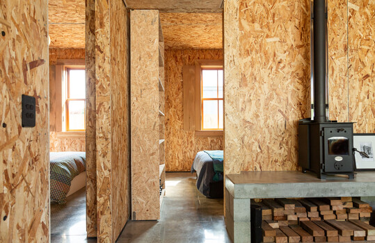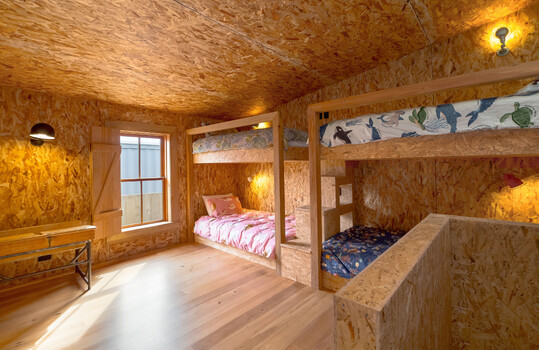 The house sleeps 10 in a unique interior that pays homage to the building that was previously there; with materials that remain honest to the nature of its construction. Featuring secret bookshelf doors, built-in bunks (perfect for kids), and re-claimed timber doors and shutters, each room is surprising and just a little bit out of the ordinary.