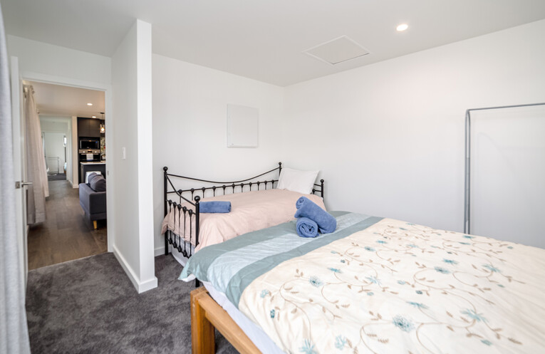 Bedroom 1:  Queen Bed plus Ensuite Bathroom  |  Bedroom 2:  Queen Bed  |  Bedroom 3:  Queen Bed plus Single Bed  |  Bedroom 4:  4 Single Beds configured as 2 bunks