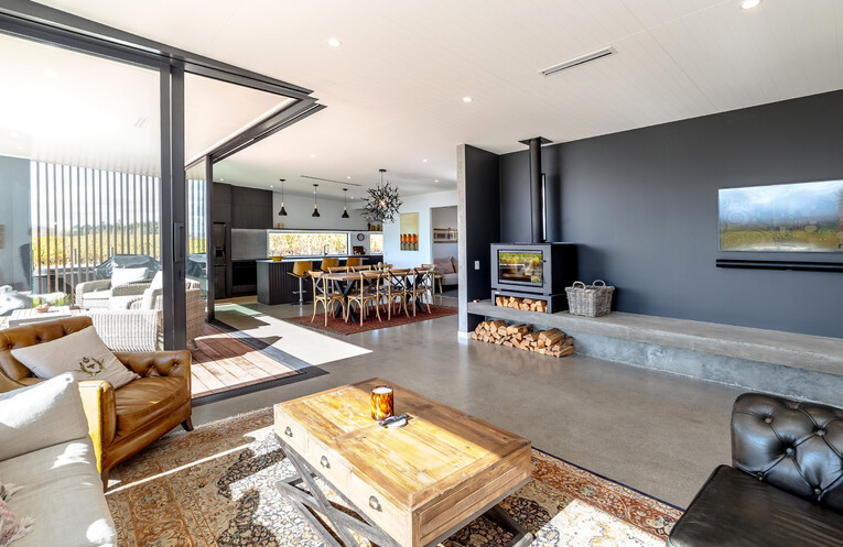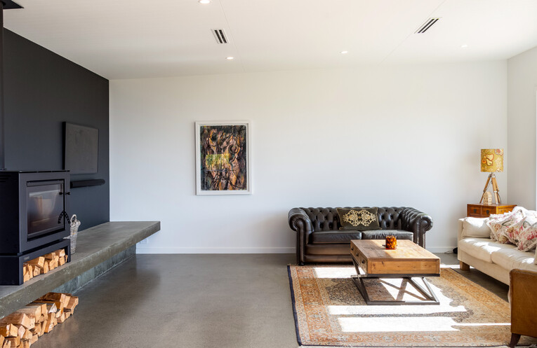 Unwind in unparalleled comfort. A sleek, lateral chef's kitchen with Fisher and Paykel appliances and a under bench wine fridge caters to every culinary whim. Integrated air conditioning ensures year-round comfort, while the exposed wood burner adds a touch of rustic charm for cozy evenings.