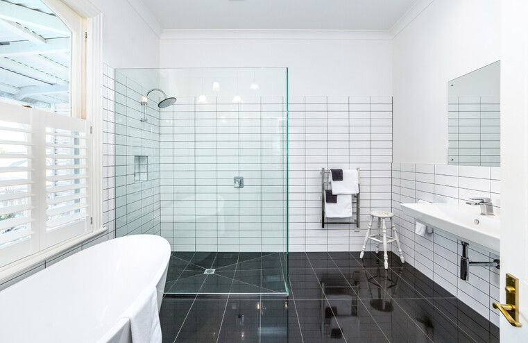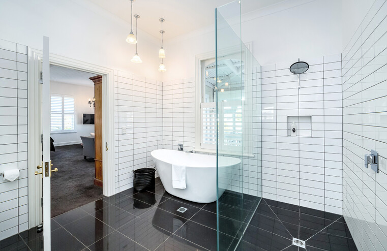 High ceilings and plantation shutters feature in this luxury studio apartment. There is a sumptuous King bed dressed in crisp white linen. A lounge area and large bathroom featuring a free standing bath tub and a huge walk in tiled shower and fluffy towels. There are tea and coffee making facilities and a bar fridge.