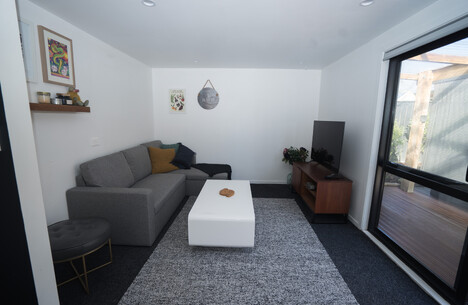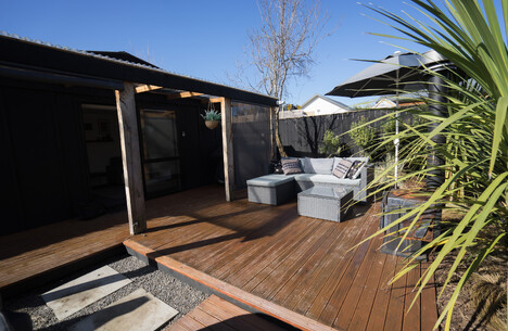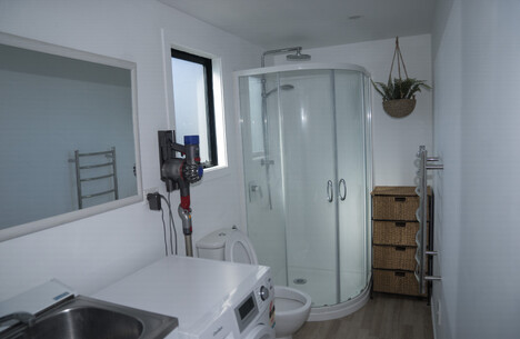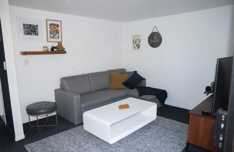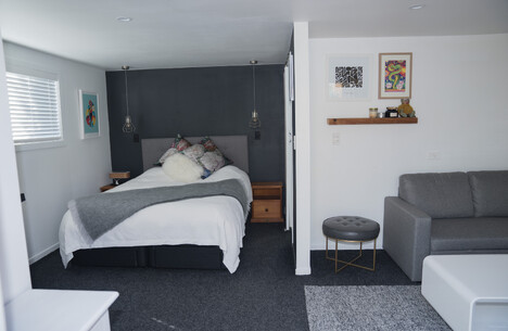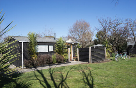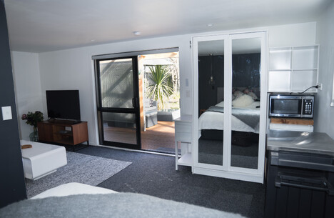Queen size bed in a small studio and an ensuite with a shower, toilet and laundry and a pull-out sofa in the sitting area. A smart TV and outdoor speakers so you can be entertained while you’re enjoying the spa. This sleep out is perfect for a short stay in Martinborough.