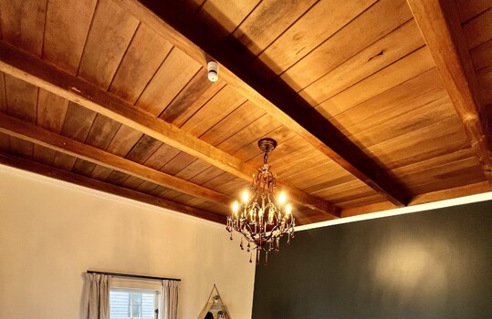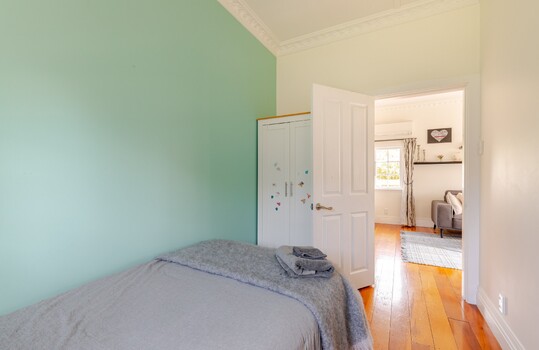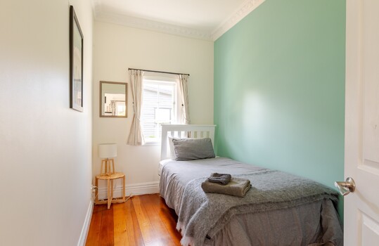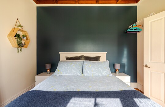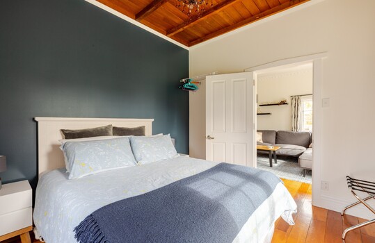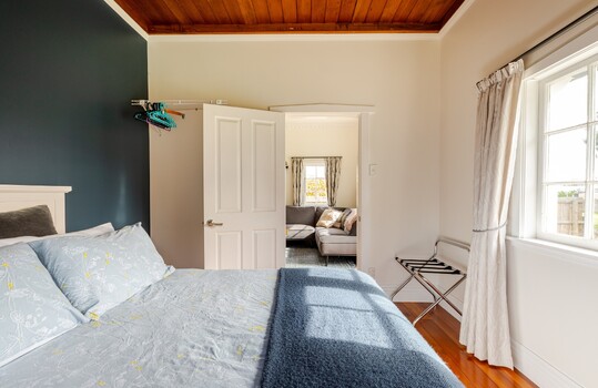 Master bedroom with stunning wooden ceiling and floors provides a cozy room that captures afternoon sun. Featuring a queen bed with side tables, clothes rack and suitcase stand. The second bedroom also features wooden floors with a king single bed, bedside lamp and free standing wardrobe.