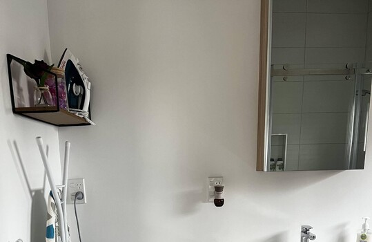 Newly decorated modern bathroom has a large fully tiled shower and toilet, including toiletries & hair dryer. It also houses the laundry including washing machine, iron & ironing board.