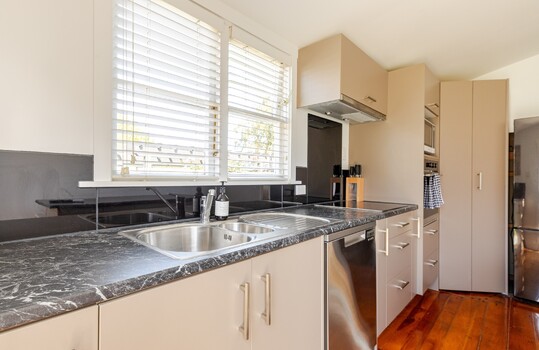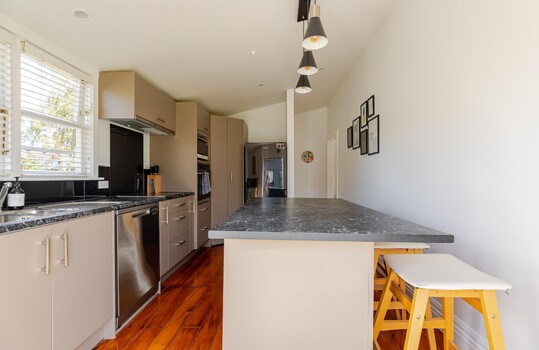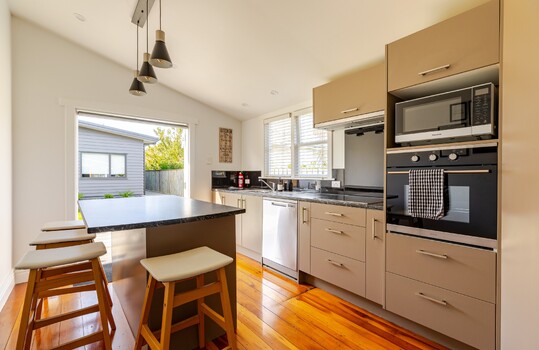 The cottage features two bedrooms and is fully equipped with everything you need for a pleasant stay. As a separate dwelling located at the back of your family home, it offers privacy and a peaceful atmosphere. The full wrap-around sunny deck is a great addition, providing a lovely space to relax and enjoy the outdoors. A well appointed kitchen with full oven, dishwasher, microwave, fridge freezer and dining island sits off the french doors which lead to the beautiful sun-filled deck, allowing a great indoor/outdoor flow.