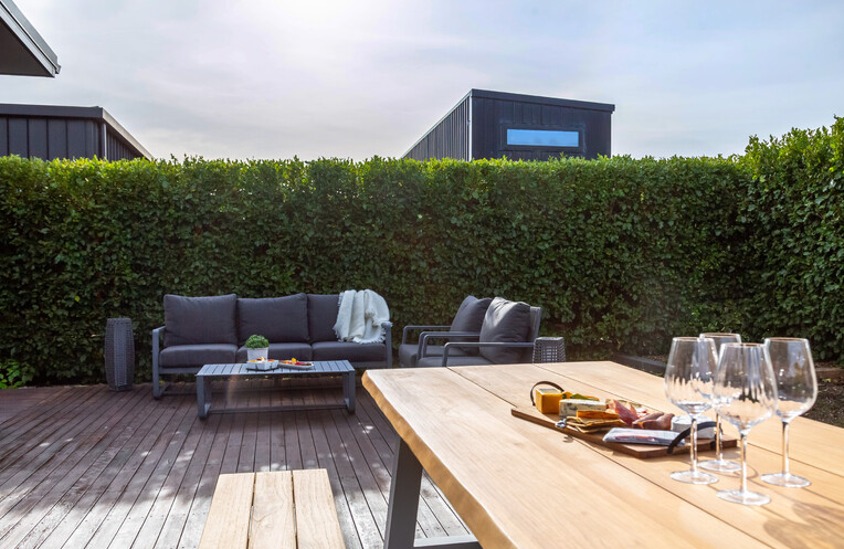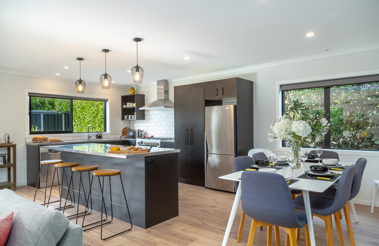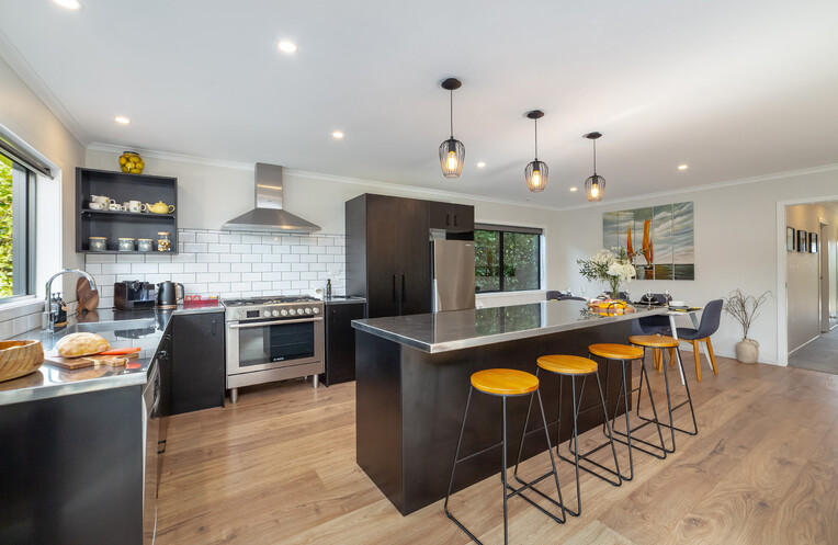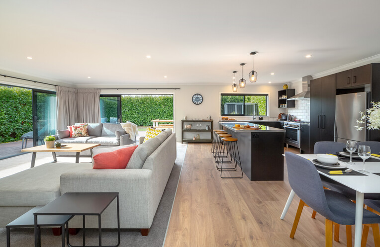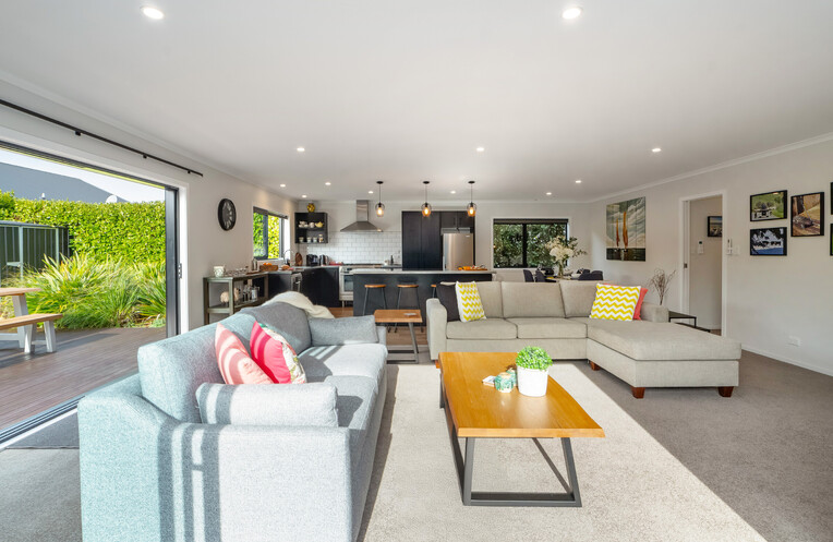Inside, the home features an open-plan living and dining area with stylish furnishings and a spacious, modern kitchen – a social space with plenty of seating. Two heat pumps ensure comfort all year round.