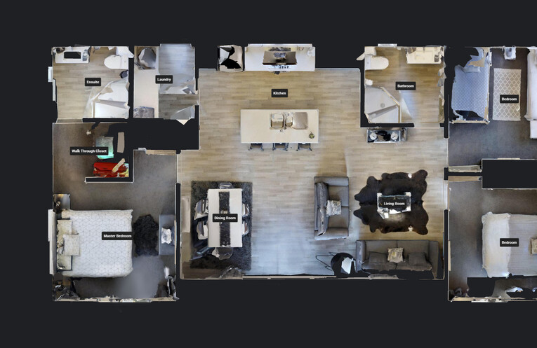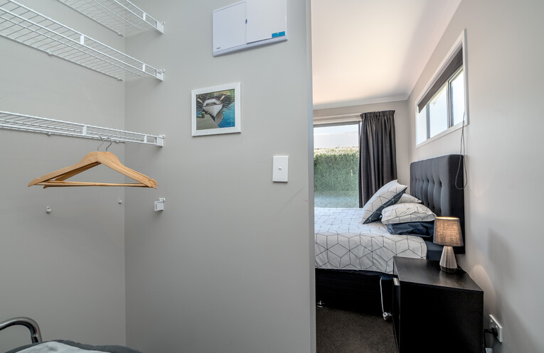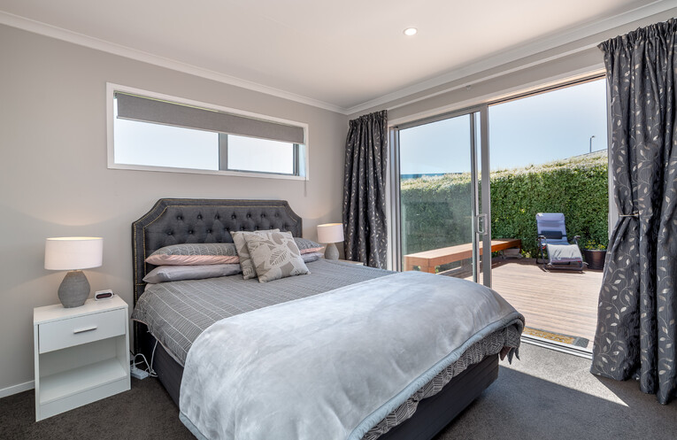 The Master bedroom has a King-sized bed, bedside tables, lamps, walk-in wardrobe and En-suite, sliding door access to the deck. Bedroom 2 has a Queen-sized bed, bedside tables, lamps, and sliding door access to the deck. The third bedroom has a single beds as well as bunk beds.