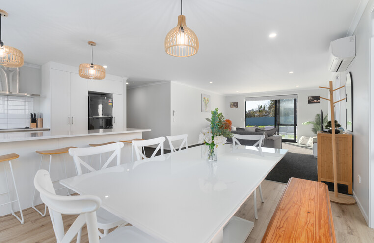 This house is large enough to sleep 10. With 1x King bed, 1x queen, 2x king singles and 2 x sofa beds. Ensuite, large open plan lounge, kitchen, dining with outdoor flow.